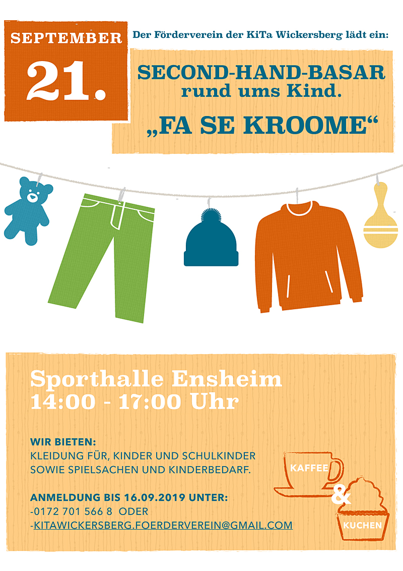 Der Förderverein KiTa Wickersberg e. V. lädt ein zum 3. Second Hand Basar: Termin ist Samstag, 21. September 2019, von 14 bis 17 Uhr, in der Sporthalle Ensheim.