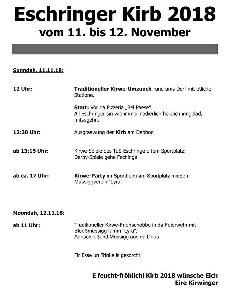 « Alle Veranstaltungen Diese Veranstaltung hat bereits stattgefunden. Kirb 11. November 2018 - 12. November 2018 « Martinsumzug Kirwe-Spiel: TuS Eschringen – FV Fechingen » Zum Kalender hinzufügen Google Kalender iCalendar Outlook 365 Outlook Live Details Beginn: 11. November 2018 Ende: 12. November 2018