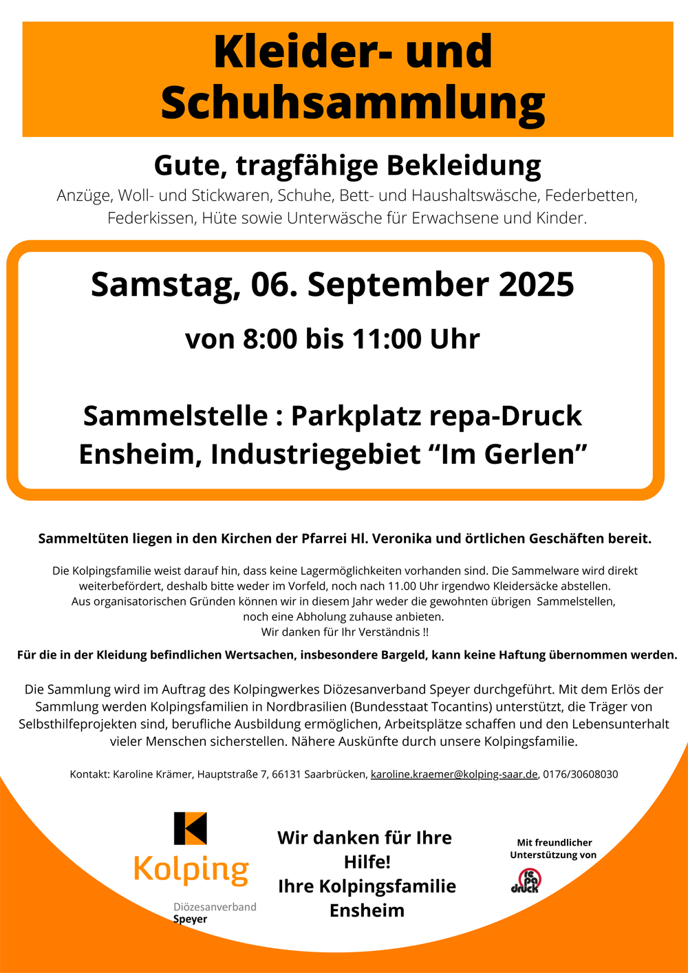 Die Sammlung wird im Auftrag des Kolpingwerkes Diözesanverband Speyer durchgeführt. Mit dem Erlös der Sammlung werden Kolpingsfamilien in Nordbrasilien (Bundesstaat Tocantins) unterstützt, die Träger von Selbsthilfeprojekten sind, berufliche Ausbildung ermöglichen, Arbeitsplätze schaffen und den Lebensunterhalt vieler Menschen sicherstellen. Nähere Auskünfte durch unsere Kolpingsfamilie.